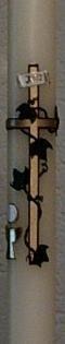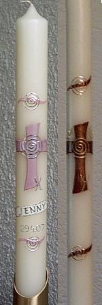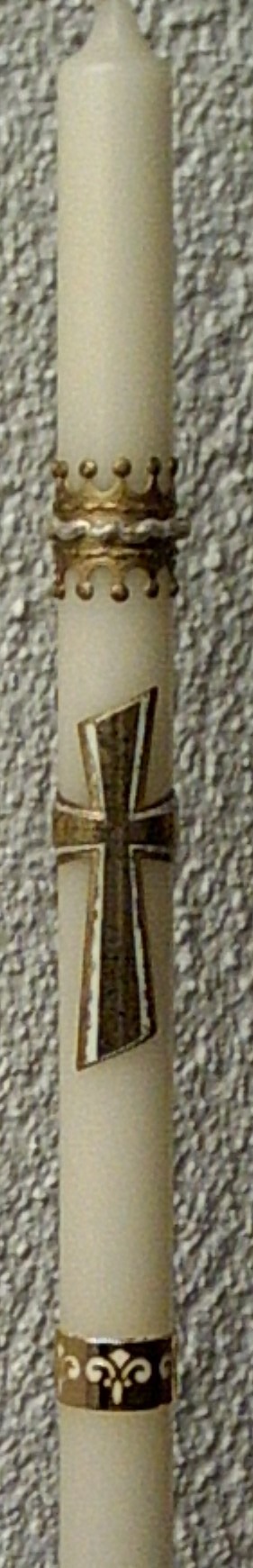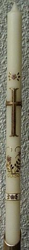 Kommunionkerze mit goldenem Kreuz mit Efeu umschlungen und mit Kreuzinschrift "INRI". Zur Linken des Kreuzes ist ein Kelch mit Hostie. Kerzengröße: DM 3 cm; Länge: 50 cm; Kerzengröße variabel! Auf Wunsch kann man das Kreuz auch mit einer Weinrebe umschlingen, Trauben dunkelrot oder dunkelblau, oder auch mit einer Blütenranke, evt. rosa Blüten für Mädchen. Hier könnte man auf die Platzkerzen z.B. ein Efeu-Blatt mit Ranke machen, die man schön seitlich auslaufen lassen könnte.