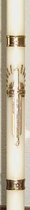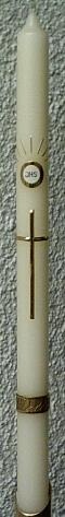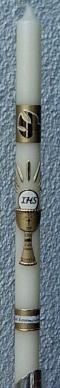 Kommunionkerze mit Kreuz in Glanzgold. Darüber Hostie "IHS" weiß mit Glanzgold unterlegt und mit Strahlen umgeben. Untere Borte als auch der Rest alles eigene Entwürfe. Kerze: 3 cm Durchmesser / Länge: 50 cm.