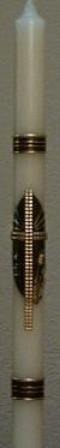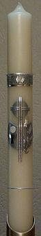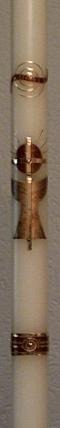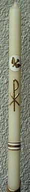 Kommunionkerze mit goldenem PAX - vorgefertigt. Darüber Taube/Heiliger Geist auf weißer Sonne eigene Anfertigung, sowie die Borte unten. Kerze: DM: 3 cm / Länge: 50 cm.