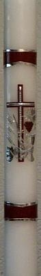 Kommunionkerze in weinrot und glanzsilber. Enthaltene Symbole sind Kelch, Weintrauben u -blätter, Ähren und Kreuz als Mittelpunkt. Name und Datum unter dem Kreuz werden in silbernen Buchstaben nachgetragen. Kerzengröße: Durchmesser: 4 cm / Höhe: 40 cm.