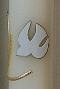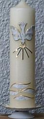 Taufkerze "Taube weiß gold". Das Motiv ist alles in Handarbeit hergestellt und angebracht. Die Taube ist erhaben auf der Kerze, die Strahlen sind in weis und gold gelegt. Der HeiligenSchein der Taube ist aus Perlwachsstreifen und ist der Ursprung der Strahlen. Die Wellen sind aus einem eigens angefertigten Wachs mit Perlmuß gesprengelt, was der glitzernden, unruhigen Wasseroberfläche entsprechen soll. Ein sehr schönes Maß für eine Taufkerze: Größe: 6 cm / 25 cm.