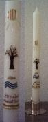 Taufkerze mit Sonne, Baum, Fisch, Wellen und Goldborte unten. Name und Datum in Handschrift dunkelbraun. Kerzengröße: Durchmesser 3 cm / Höhe: 40 cm. Ständer als Zubehör vorhanden! 12 Euro, variabel je nach Kerzengröße. Kerzenhalter für 3 cm Durchmesser. Die Kerzenhalter gibt es auch für 4 cm und 5 cm auf Anfrage!