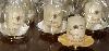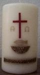 Platzkerzen mit dem Motiv der Hostie und Kreuz in Glanzgold - Preis: 2,50 Euro/Stück incl Messingständer und Deckchen in der passenden Farbe! Blütenmotiv rosa oben: 2,80 Euro/PK komplett.