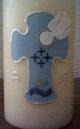Taufkerze. Symbole für Wasser = Wellen, Alpha & Omega in silber rechts und links des Kreuzes, Heiliger Heist von rechtsoben mit Heiligenschein in silber. In der Mitte des hellblauen Kreuzes sind 4 dunkelblaue kleine Kreuze! Dieses Motiv kann natülich auch in rosa oder anderen Farben gefertigt werden. Kerzengröße variabel: Durchmesser: 3, 4, 5, 6 und 8 cm in verschiedenen Höhen. Für das Kreuz stehen auch andere Formen zur Verfügung.