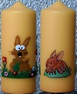 Zu Ostern: Osterhasen - mal was anderes. Links: Hase und alle Pflanzenteile aus Wachs ausgeschnitten und zusammengesetzt. (6/15cm). Rechts: Motiv auf Wachs vorgezeichnet und ausgemalt. (6/15 cm).
