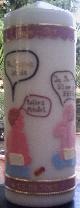 "Baby-Talk": Baby1: "Du, Jana ist da!". Baby2: "Ja, Du! 53 cm und 3890 gr." Baby1: "TollesMädel." Diese Kerze wurde im Freundeskreis an frisch gebackene Eltern einer Tochter verschenkt. Zum Motiv: Zwei Babys unterhalten sich über einen Neuankömmling in der BabyRunde. Zur Geburt gibt es viele Motivvarianten für eine Kerze. Es ist fast der schönste Anlaß, zu dem man eine Kerze verschenken kann. Ungezwungen, voller Freude, die man mit den Eltern teilen kann. Die Eltern werden dieser Kerze immer einen besonderen Platz widmen. Kerze: DM 7 cm / Höhe: 20 cm.