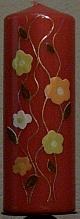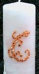 Kerze terracottafarben mit zitrongelben, orangenen, cremefarbenen Blüten und olivegrünen Blättern. Wellenlinien in Glanzgold. Kerzengröße: Durchmesser: 7 cm / Höhe: 20 cm. Farben variabel! zB. Gelbe Kerze mit zitrongelb, gelbgrün, orange und hellgrünen Blättern; oder blaue Kerze mit hellblau, dunkelblau, weiß und alusilbernen Blättern und Wellenlinien in Glanzsilber!