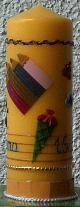 Zum 1. Schultag. Motivverteilung rundrum. Schultafel, Bleistifte, Schultüte und noch vieles mehr. Name des Erstklässlers kommt auf die Schreibhilfslinien auf dem unteren drittel der Kerze. Die Kerze ist auch bei folgenden Kindergeburtstagen oder Familienfeiern auf dem Kaffeetisch eine schöne Dekoration. Kerzengröße: 7 cm / Höhe: 20 cm. Preis: 16,- €. Farbe wählbar.