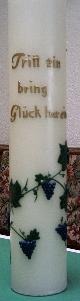 Spruchkerze. Diese Kerze steht im Untertal am Rande des Bühlertäler Weinanbaugebietes. Ein Spruch oder eine Lebensweisheit auf einer Kerze werden immer gerne mit Freude betrachtet. Die Weinreben mit Trauben in den Farben blau oder weinrot sind ebenfalls immer ein schöner Schmuck für eine Kerze. Kerzengröße: Durchmesser: 67 mm / Höhe: 400 mm. Der Preis richtet sich nach der Üppigkeit, mit der die Kerze dekoriert werden soll. Diese hier mit der Größe würde um die 24,- € kosten - aber - sprechen Sie mit mir.